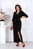 Платье с застежкой на потайную молнию в среднем шве спинки, с круглым вырезом горловины,со съемным воротником. По переду с рельефами, выходящими из проймы. Платье отрезное по линии талии. Нижняя часть переда и спинки расширенная к низу. По нижней части переда два рельефа, левый рельеф заканчивается разрезом. Нижняя часть спинки со средним швом, двумя рельефами. Рукав втачной, длинный, со съемными манжетами. Силуэт: полуприлегающий
