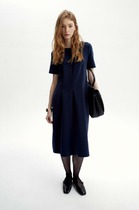 Платье полуприлегающего силуэта, с застежкой на потайную молнию в среднем шве спинки, без воротника, с круглым вырезом горловины. По переду с рельефами, выходящими из проймы. Спинка со средним швом, рельефами, выходящими из проймы. Рукав втачной, длинный, с отрезной манжетой . Из боковых швов и рельефов переда выходят навесные петли, в которые протянут декоративный шнур.