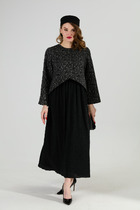 Платье без воротника, с круглым вырезом горловины, застежкой на потайную молнию в среднем шве переда. Перед с нагрудными вытачками, средним швом, асимметричной фигурной планкой с люверсом, представляющей собой карманчик. Спинка с вытачками, выходящими из горловины. Боковые части спинки цельнокроенные с планками низа.