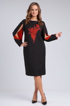 Платье с центральной застежкой на петли и пуговицы, втачным воротником с отрезной стойкой. По переду с клапанами. Спинка с отрезной кокеткой, переходящей на перед. Платье двойное. Нижнее платье на бретелях, с нагрудными вытачками по переду. Платье со съемным поясом.