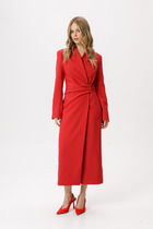 Платье с центральной застежкой на петли и пуговицы, на широких бретелях. Платье отрезное по линии талии. Верхняя часть переда с талиевыми вытачками, нижняя часть переда с карманами и односторонними складками по талии. Нижняя деталь спинки с талиевыми вытачками. Платье со съемным поясом.