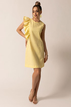 Платье с круглым вырезом горловины, без воротника, застежкой на петли и пуговицы по спинке. Платье отрезное по линии талии, с втачным поясом. Верхняя часть переда с рельефами, выходящими из проймы. Верхняя часть спинки с талиевыми вытачками, фигурным вырезом горловины и фигурным вырезом по низу, застежкой на две петли и пуговицы. Нижняя часть платья со сборкой по шву притачивания к поясу. Рукав втачной, короткий. В боковых швах расположены карманы.
