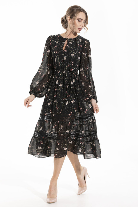 Платье, с центральной застежкой на навесные петли и пуговицы, без воротника, с круглым вырезом горловины. По горловине переда частично расположена сборка. Платье отрезное по линии талии.  Шов по талии присборен на резинку. Нижняя часть платья с двумя отрезными воланами и втачными деталями из кружева.. Рукав втачной, длинный, с отрезной узкой манжетой. Окат и низ рукава присборен. Платье со съемным поясом.