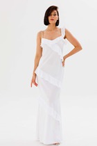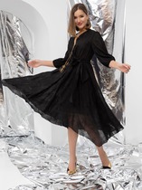 Платье, без воротника, с центральной застежкой на потайную молнию в среднем шве спинки. Платье отрезное по линии талии. Лиф переда с рельефами, выходящими из горловины. Лиф спинки со средним швом, рельефами, выходящими из проймы. Нижняя часть спинки со средним швом, талиевыми вытачками. Платье на широких бретелях, присборенных по шву притачивания к верхнему срезу платья по переду и спинке. Рельефы переда и спинки усилены регилином. Рукав втачной, длинный, с отрезной манжетой. Рукав присборен по окату и шву притачивания манжеты.