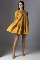 Платье без воротника, с фигурным вырезом вырезом горловины, застежкой на потайную молнию в среднем шве спинки. Платье отрезное по линии талии. Лиф с рельефами, выходящими из горловины. Рельефные швы лифа усилены регилином. Лиф спинки с рельефами, выходящими из горловины. Спинка со средним швом. Рукав втачной, длинный, с отрезной манжетой. По окату рукава-притачная планка, присборенная на резинку. Низ рукава присборен по шву притачивания манжет.