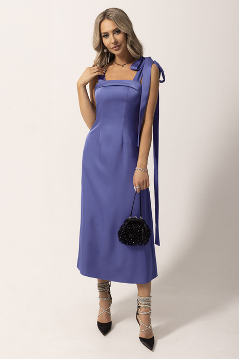 Платье без воротника, на бретелях- завязках , застежкой на потайную молнию в среднем шве спинки. По переду с нагрудными вытачками. По спинке- со средним швом, талиевыми вытачками. Вырез спинки-V-образный. Планка спинки присборена на резинку.