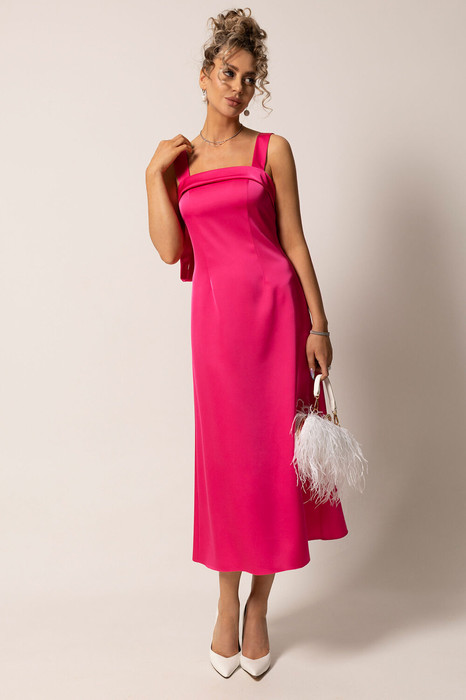 Платье без воротника, на бретелях- завязках , застежкой на потайную молнию в среднем шве спинки. По переду с нагрудными вытачками. По спинке- со средним швом, талиевыми вытачками. Вырез спинки-V-образный. Планка спинки присборена на резинку.