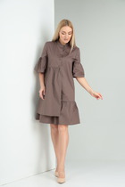 Платье прямого силуэта, без воротника, с круглым вырезом горловины, без застежки. По горловине переда фигурный вырез, срез горловины обработан бейкой. Перед с талиевыми вытачками, в боковых швах расположены карманы. Рукав втачной, длинный.