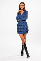 Платье полуприлегающего силуэта, без воротника, с фигурным вырезом горловины, с застежкой на потайную молнию по среднему шву спинки. Платье отрезное по линии талии. Верхняя часть переда с фигурной драпировкой, уходящей в шов по талии. Спинка со средним швом, заканчивающимся шлицей, талиевыми вытачками и рельефами по верхней части спинки. Рукав втачной, длинный со складками по окату.