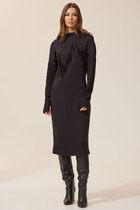 Свободное платье-свитер прямого покроя с разрезом по детали переда с левой стороны. Линия плеча спущенная с втачным рукавом прямого покроя стандартной длины. Вырез горловины округлый со свитерным воротником.