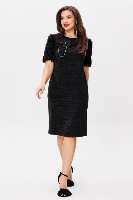 Платье Женское полуприлегающего силуэта, выполнено из фактурного трикотажа. Вырез горловины округлый, рукав втачной до локтя, выполненный из декоративной ткани в виде перьев. По боковым швам отрезные бочки для лучшего приталивания, застежка на тесьму-молнию в среднем шве спинки, по низу разрез. В комплекте сьемная брошь-цветок.