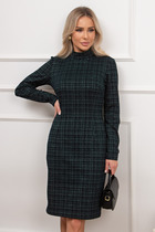 Платье- рубашка свободного силуэта, комбинированно из двух тканей. Вырез горловины рубашечного типа, застежка на петли и пуговицы по переду. В боковых швах карманы, по переду кокетка и клапаны. В комплекте ремень из основной ткани. Рукав длинный на манжете внизу.