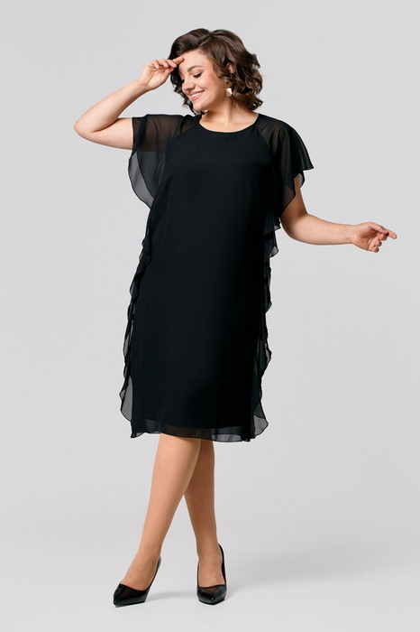 Платье женское прямого силуэта из легкой шифоновой ткани на подкладке из трикотажного полотна с антистатическим эффектом; рукава реглан, переходящие в декоративные воланы по переду и спинке.                                                                                                              Рекомендована стирка при t не выше 30 С, глажение при t  прессующей поверхности не выше 110 С. Длина 103 см.