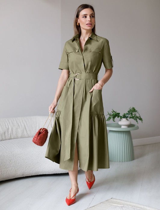 Состав: 100%Хлопок Параметры модели на первом фото: Рост 170, бюст 89, талия 63, бедра 92 Размер товара на первом фото: 42Платье-рубашка выполнено из легкого хлопкового поплина. Модель с воздушной юбкой-воланном дополнена крупными накладными карманами и поясом из основного полотна с золотистой фурнитурой. Благодаря силуэту в стиле new-look изделие моментально сделает образ женственным и романтичным. Натуральный состав ткани обладает высокой воздухопроницаемостью и гигроскопичностью. В изделии будет комфортно, даже в самое жаркое время года. Подходит для любой фигуры.