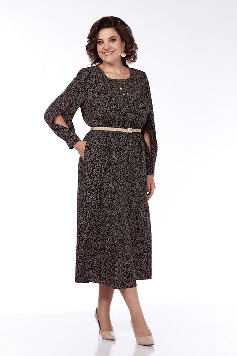 Платье женское, нарядное выполнено из плательной ткани, А-силуэта. Изделие отрезное по линии талии и собрано на эластичную тесьму. По центру лифа складка декорированная пуговицами. Верхняя часть спинки цельная. Юбка платья 4х-клинка. В боковых швах обработаны карманы. Рукава втачные двухшовные по переднему шву разрез. Рукава на манжете с застежкой на две петли с пуговицами. Нижняя часть платья на подкладке. К изделию прилагается ремень.