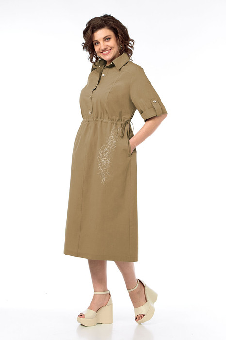 Платье женское свободного силуэта, выполнено из плательной ткани. Воротник рубашечного типа, застежка центральная до талии на петли с пуговицами. Платье разрезное по линии талии, по переду и спинке обработана кулиса со шнурком. Верхняя часть переда с кокетками и  рельефами. Нижняя часть переда со средним швом. Спинка разрезная, со средним швом и  разрезом внизу. Рукава втачные с отложными манжетами и патами, для регулировки длины. Платье дополнено дизайнерской вышивкой и отделочными строчками.
