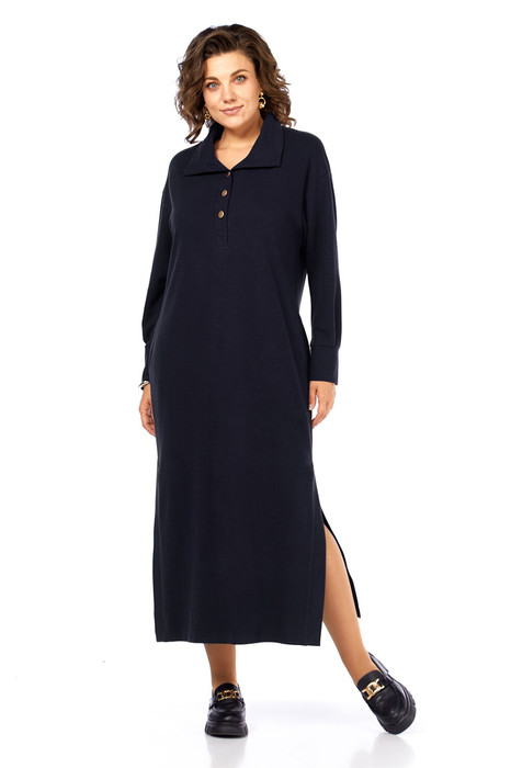 Платье женское прямого силуэта, выполнено из трикотажного полотна. Горловина обработана воротником стойкой, застежка планка на петли и пуговицы. В боковых швах обработаны карманы, по низу шлицы. Рукава спущенные, длинные внизу на манжетах.