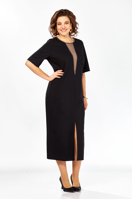 Платье женское, нарядное, полуприлегающего силуэта выполнено из трикотажного полотна. Горловина круглой формы. По переду обработаны нагрудные вытачки и фигурная вставка из отделочной ткани. По горловине и вставке  декоративная тесьма.  По переду в среднем шве внизу обработан разрез. Спинка с талиевыми вытачками и  со средним швом, в котором обработана застежка на навесную петлю и пуговицу. Рукава втачные, длиной до локтя.