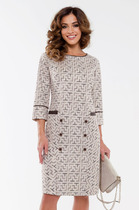 "Платье женское, прямого силуэта, выполнено из льняной ткани с фигурным вырезом по горловине. По переду обработаны нагрудные вытачки. Спинка цельнокроенная. Рукава втачные, по окату рукава сборка, нижний срез фигурной формы. Рукав декорирован навесной петлей и пуговицей. Платье дополнено дизайнерской вышивкой в стиле ришелье.
