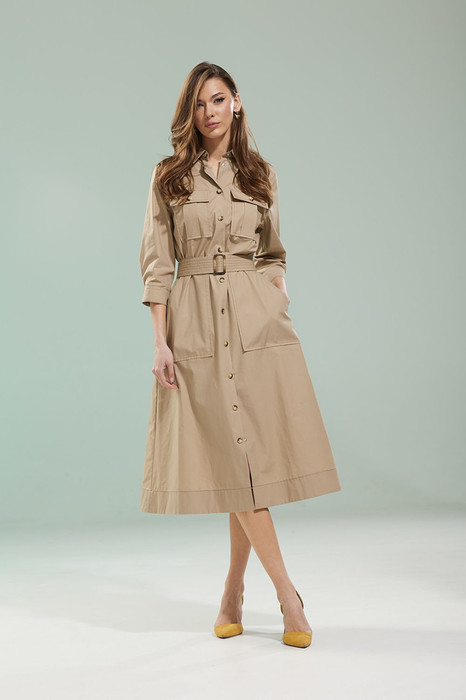 Платье отрезное по линии талии, со сквозной центральной застежкой на кнопки. По переду лифа расположены накладные карманы с клапаном, застегивающиеся на кнопку, заложены складки в области талии. Спинка лифа с отстрочной кокеткой и небольшими складками. По переду юбки расположены большие накладные карманы с наклонным входом. По талии спинка присборена на резинку. Плечо спущено. Рукав одношовный, длиной ниже локтя, по низу обработан притачной манжетой с планкой, застегивающимися на кнопки.  По горловине воротник рубашечного типа с отрезной стойкой. Низ платья с широкой подгибкой. Все отделочные строчки выполнены гарусной нитью контрастного цвета. Платье комплектуется съёмным поясом из основной ткани, затягивающимся на декоративную пряжку.