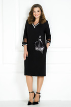 Платье женское из двух видов ткани (1) 69% ПЭ, 27% вискоза, 4% спандекс; (2)98 % ПЭ, 2% лайкра), полуприлегающего силуэта.
