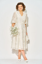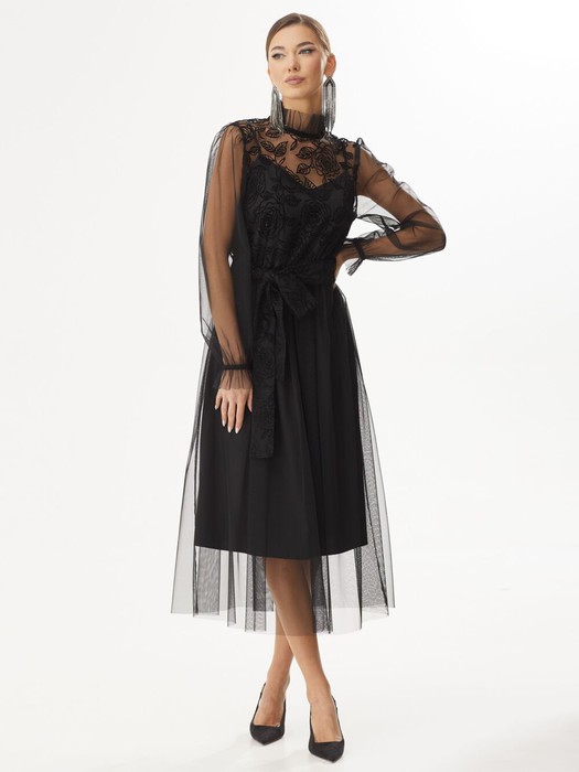 Платье двухслойное полуприлегающего силуэта, отрезное по линии талии. Верхний лиф выполнен из фатина с флоком. Перед и спинка цельнокроеные. В области горловины обработана застежка-капелька на навесную петельку и пуговицу. Нижняя юбка прямая, верхняя юбка собрана по линии талии. Рукав длинный, втачной, по низу оборка, на запястье просборен на резинку. Горловина округлой формы, декорирована тесьмой. В комплекте съемный пояс.