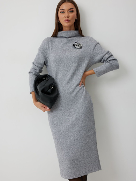 Платье трикотажное полуприлегающего силуэта  с карманами в боковом шве. Длина платья до середины икры. Платье с цельнокроеной  горловиной и спущенной линией плеча. Спинка со средним швом. Платье дополнено съемным авторским декором.