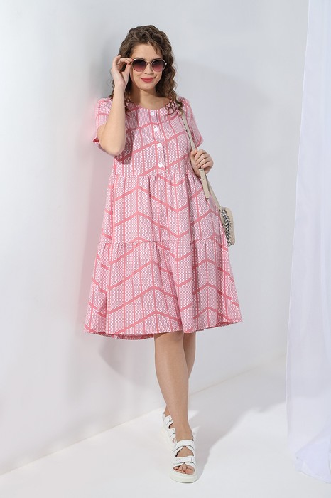 Платье женское из трикотажного полотна «кулика» с набивным рисунком, отрезное по линии талии, с короткими втачными рукавами, горловиной овальной формы и центральной бортовой застежкой по лифу на петли и пуговицы. Юбка – из двух ярусов, каждый из которых присборен по шву стачивания с верхней деталью. Горловина овальной формы окантована по спинке и обтачана по переду.