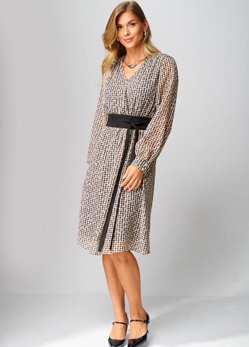 Платье женское, повседневное, на подкладке,свободного силуэта, расширенное книзу, длиной ниже коленей, с втачными рукавами, со съемным поясом. Вырез горловины детали переда платья «V-образной» формы, по центру обработана складка. По плечевым швам обработана сборка. Рукава втачные одношовные, с притачными манжетами, с застежкой на 2  петли и 2 пуговицы. Разрезы обработаны окантовкой, по швам притачивания обработана сборка.                                            Платье: длина рукава  - 61см, ширина рукава – 21см, длина спинки – 107см.