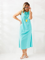 Платье женское, повседневное, на подкладке,свободного силуэта, расширенное книзу, длиной ниже коленей, с втачными рукавами, со съемным поясом. Вырез горловины детали переда платья «V-образной» формы, по центру обработана складка. По плечевым швам обработана сборка. Рукава втачные одношовные, с притачными манжетами, с застежкой на 2 петли и 2 пуговицы. Разрезы обработаны окантовкой, по швам притачивания обработана сборка. Платье: длина рукава - 61см, ширина рукава – 21см, длина спинки – 107см.