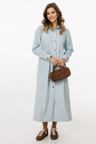 Вырез горловины округлой формы с втачной бейкой. Перед и спинка цельные. Рукава втачные одношовные длинные, линия плеча спущена. В левом боковом шве обработан разрез. В комплекте съемный пояс с застежкой на пряжку. На съемном поясе обработан карман с листочкой с втачными концами.