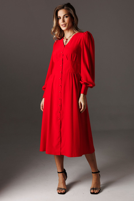 Воздушное элегантное платье. Изделие состоит из отрезного лифа, спереди со складками по линии груди, по спинке - сборка. Юбка изделия имеет расклешение к низу, по талии фрагментами сборка. Лиф и юбку соединяют облегающие рельефные детали, имитирующие фигурный корсет, высотой от 7,5-12 см. Спереди платье на застежке: петли-пуговицы. Горловина имеет V-образный вырез. Рукав втачной, одношовный, с притачной манжетой. Длина рукава в готовом виде 65,5 см. По окату и низу рукава: сборка. Спереди платье имеет застежку на петли-пуговицы. Длина платья по спинке 112-115 см (согласно размерному ряду). Платье на трикотажной подкладке (лиф платья и юбка).