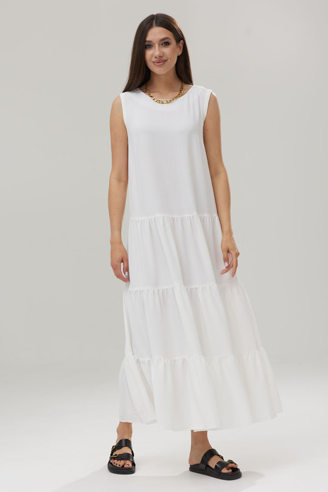 Превосходное свободное однотонное платье А-силуэта. Платье состоит из отрезного удлиненного лифа и юбки, состоящей из трех горизонтальных воланов со сборкой. Спереди лиф платья имеет нагрудные горизонтальные вытачки. Округлая горловина и проймы изделия обработаны окантовочной тесьмой. Длина платья по спинке 134-136 см (в зависимости от размерного ряда) Длина лифа по спинке-52 см.