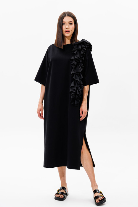 Платье прямого свободного силуэта (в стиле oversize) со спущенной линией плеча. Горловина округлой формы, обработана планкой-бейкой шириной 2,5 см. Длина спущенной линии плеча 23 см. Длина рукава 27 см. На детали полочки украшением платья (длина рюши 50 см) и спинки (длина рюши 27 см) расположена декоративная деталь: вертикальная ассиметричная рюша, шириной 20 см из воздушной отделочной ткани. В левом боковом шве платья расположен открытый разрез, высота разреза 42 см.