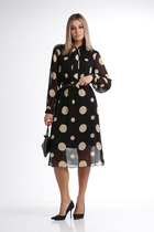 Платье женское, по линии талии отрезной фигурный пояс, нижняя часть платья со сборкой и в нижнюю часть платья вставлена хлопковая подкладка. По верхней части переда небольшая сборка из линии пояса. Спинка с узкой горизонтальной кокеткой. В верхней части спинки из линии кокетки и линии пояса спроектирована небольшая сборка. Вырез горловины "V- образной" формы. Рукав одношовный, короткий, втачной, со сборкой по окату. В боковых швах расположены функциональные карманы. Застежка на петли и пуговицы до низа изделия.