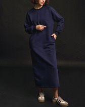 Платье свободного силуэта со спущенной линией плеча. Воротник рубашечного типа на стойке. Центральная застёжка на петли и пуговицы. По передним половинкам платья накладные карманы с цельнокроеным клапаном. Низ платья фигурный. Спинка платья чуть длиннее переда, по низу обработана обтачкой. Низ присборивается на шнур из основной ткани, таким образом формируя желаемый силуэт платья. Рукав двухшовный. Низ рукава на притачной манжете с патой. По верхнему центральному шву рукава пришиты две пуговицы, что позволяет регулировать длину рукава.