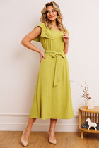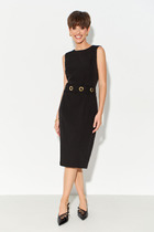 Платье с округлым вырезом горловины, отрезное по талии и съёмным поясом из ткани. Перед с кокеткой из сетки горохи флок и дизайнерским вырезом в верхней части. Нижняя часть переда со встречной складкой. Спинка с талиевыми вытачками и потайной молнией в среднем шве. Рукава втачные выполненные из сетки горохи флок. Изделие с карманами в боковых швах.