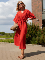 Платье длины "миди" с объёмной юбкой выполнено из лёгкой ткани с принтом. Застежка на потайную молнию по среднему шву спинки. В комплекте идет длинный съемный пояс. На юбке по линии талии заложены складки.
