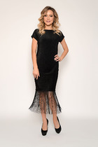 Платье приталенного силуэта выполнено из плотного трикотажного полотна. Перед платья декорирован сеткой с вышивкой из пайеток. По спинке расположены талиевые вытачки. По среднему шву спинки  разрез длинной 56 см и застежка на потайную молнию. Горловина и пройма обтачные, рукав выполнен в виде небольшого "крылышка".