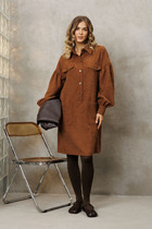 Платье свободного силуэта выполнено из плательной ткани с анималистическим принтом "леопард". Рукав втачной, по низу рукава манжеты на застёжку петлю и пуговицу.  Воротник рубашечного кроя, застёжка до линии талии на петли и пуговицы, по лифу клапаны выше линии груди клапаны. Линия талии отрезная на резинке.  По переду юбки два глубоких запаха, которые фиксируются навесными петли и пуговицами. По лифу спинки кокетка и отрезная линия талии. К платью прилагается съёмный пояс из основной ткани, на резинке, с металлической пряжкой.