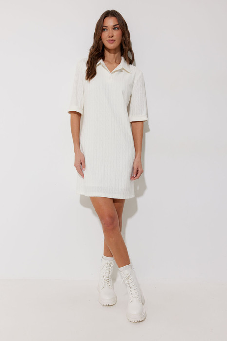 Платье-поло из трикотажного жаккардового полотна. Длина мини. Платье свободное, с небольшим расширением к низу. С отложным воротником. По переду планка с застежкой на петли-пуговицы.   По переду нагрудные вытачки. Рукав короткий с отложной манжетой. Воротник, планка и манжета выполнены из трикотажного полотна в тон основной ткани. Платье на трикотажной подкладке. Обращаем Ваше внимание, что фурнитура может незначительно отличаться от фото.