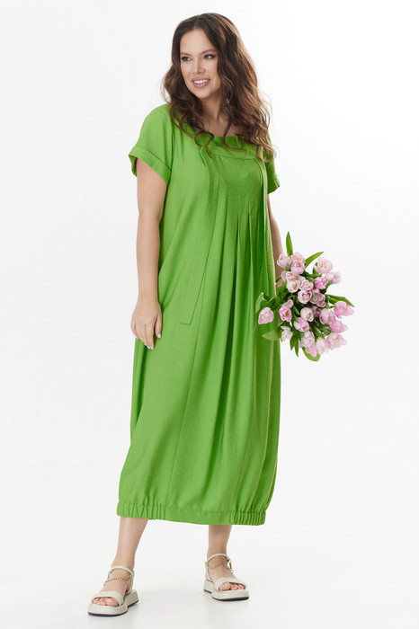 Стильное летнее платье свободного силуэта с коротким втачным рукавом. Оригинальная обработка горловины придает платью неповторимый шарм. По низу платье дополнено сборкой на эластичную тесьму, что придает легкий объем. По спинке застежка на пришивную пуговицу. В боковых швах расположены удобные карманы. Длина платья от плечевого шва 128см. Длина рукава 20см.