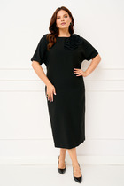 Нарядное платье свободного кроя в стильном сочетании тонкого гладкого трикотажа и легкой текстильной сетки. Верхнее и нижнее платье скреплено по плечевому шву.  Горловина округлой формы Рукав втачной, слегка спущен (7/8) Длина нижнего платья от плечевого шва 119см. Длина рукава 50см.