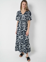 Платье женское отрезное по линии талии, расширенное книзу по центральной застежке на петли и пуговицы. Перед с нагрудными вытачками и вышивкой с левой стороны в области груди. В боковых швах - карманы. Спинка со средним швом по нижней части. Горловина округлой формы, слегка углублена. Рукав втачной одношовный, короткий с отложной манжетой по низу. Платье в комплекте с декоративным ремнём.