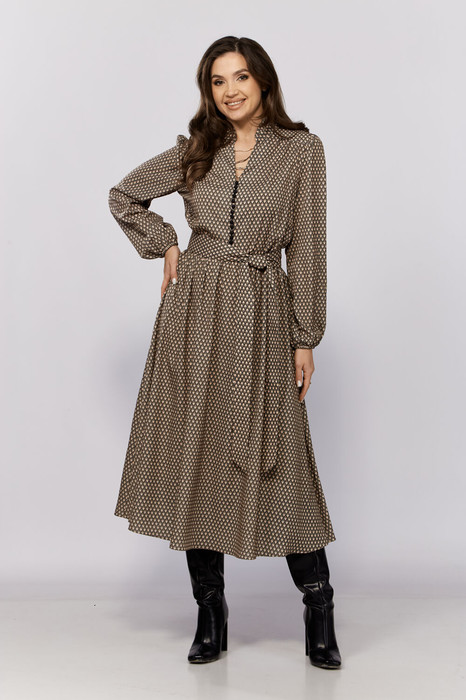 Платье шифоновое с подкладкой на юбке свободного силуэта, приталенное за счет резинки на поясе. Спереи декоративная застежка на воздушные петли и пуговицы. Воротник-стойка с рюшей. Рукав втачной, расширенный книзу, собран на резинку.