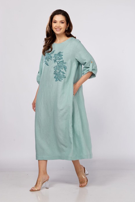 Платье в стиле бохо силуэта трапеция.Спинка со средним швом.По переду нагрудные вытачки и декоративная вышивка.Горловина слегка расширена, округлой формы. Рукав втачной ,3/4. Низ рукава подбирается патой с застёжкой на пуговицу. В боковых швах обработаны карманы.