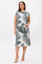 Платье прямого силуэта,с карманами и разрезами в боковых швах. По спинке средний шов. По переду нагрудные вытачкии и декоративная вышивка в области груди. Горловина округлой формы, обработана кружевом. Плечо спущено. Рукав 3/4 с цельнокроенной манжетой. Пояс из основной ткани.