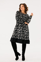 Женское трикотажное платье выполнено из футера 3-х нитка, для повседневной носки  станет одним из базовых и любимых изделий в Вашем гардеробе. Платье прямого полуприлегающего силуэта, длиной до колена, однотонное с контрастными  манжетами из довяза и планкой горловины. Вырез горловины круглый, рукав втачной длиной 3/4. Украшением платья служит контрасная вышивка из шнура и пристегивающиеся меховые пушки.