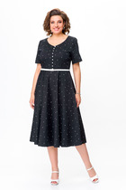 Платье в стиле casual предназначено для повседневной носки, прекрасно сочетается с любой по стилю обувью. Платье выполнено из вискозной ткани, свободного кроя, ниже колена, рукав укорочен. В качестве декора по переду изделия — вставлена планка из контрастной ткани, на планке нанесены небольшие стразы. По бокам изделия — разрезы, которые также обработаны контрастной тканью, в цвет декоративной планки. Также в изделии имеются боковые карманы.