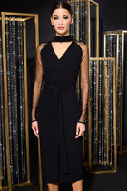 Очень торжественно и гламурно, так можно охарактеризовать это платье! Оно покорит Вас с первой примерки. Нарядное женское платье, выполнено из бархата и гипюра с цветочным мотивом, расшитого золотом. На полочке обработаны отрезные бочки и кокетка из бархата и гипюра, с фигурными элементами, настроченными по шву, горловина обработана обтачкой. Рукав оптимальной длины, из бархата и настроченными элементами из кружева. Спинка с средним швом и полу-рельефами, выполнена из однотонного черного бархата, в верхней части кокетка с гипюром наложенным на бархат. Платье прекрасно стройнит и подойдет для торжественных мероприятий, а благодаря хорошему стрейчу ткани будет "сидеть" на фигуре отлично! Мужчинам верить нельзя, но как можно не верить комплиментам? В этом платье они Вам гарантированы!